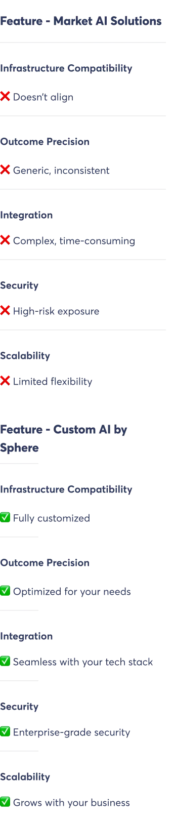 Off-the-shelf AI solutions are built for general use, not for your specific workflows, data, or security requirements. Most AI solutions promise the world but deliver frustration. You invest time and resources, only to realize: